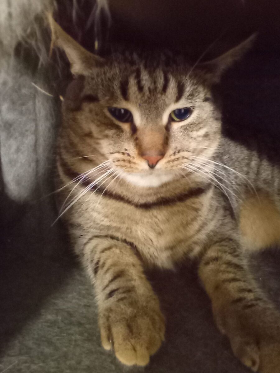 Michał to kocurek, który ma w sobie więcej emocji, niż można by się spodziewać. Jego szare futerko, lekko postrzępione, zdaje się kryć w sobie historię pełną strachu i niepewności. Na pierwszy rzut oka widać, że nie jest jeszcze gotowy na bliskość z ludźmi – woli skrywać się w domku na drapaku, gdzie czuje się bezpiecznie.
