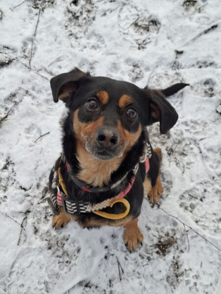 Na spacerze idzie żwawo przed siebie, na luźnej smyczy, sprawdzając co chwilę czy człowiek idzie za nią. Ruch uliczny nie jest jej straszny. Z innymi psami bardzo dobrze się dogaduje. Przy tych bardziej nachalnych czuje się niepewnie, ale z zrównoważonym psiakiem jak najbardziej mogłaby zamieszkać. Ze względu na jej wiek powinna trafić do domu z małą ilością schodów.